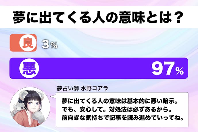 2 推しが家に来る夢の意味は「嬉しい出会いが訪れそう」 誰かが家に来る夢を見て、もし来客へいい印象を持つ場合、あなたがこれから新しい出会いや幸運を与えてくれる人と出会える可能性があることを示唆しています。 したがって、もし推しが自宅へ 亡くなった父親・母親が出てくる夢 両親の夢は、故人に対する思いもひとしおであるため、死を惜しむがゆえに夢に現れると解釈されています。 ただし、死後何年か経つ場合や、故人に話しかけられる夢は、重要なメッセージ性があると考えてよいでしょう。 メッセージ性がある夢は、現状を好転させるアドバイスを伝えようとしていることが多く、両親が笑顔 夢に出てくる人の意味とは? 夢占いで夢に出てくる人は、 基本的には、" あなたという存在の一部 "の象徴です。 特に、見たことも無い知らない人や、 好きでも嫌いでもない人が夢に現れてくるのは、 その人の姿を借りることで、 自分自身のことを客観的に見ようとする 深層の心理の働きと言えます。 もちろん、実在の人が登場する夢は、